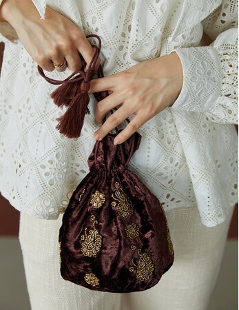 上品な光沢のあるベロア生地を使用した巾着型のバック。