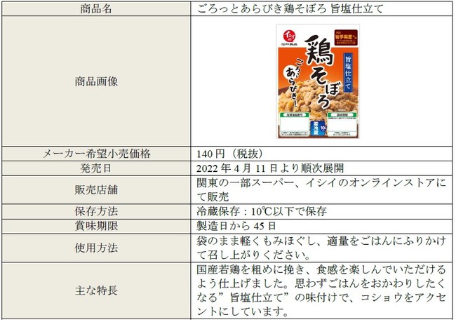 無添加調理※で商品作りを進めている石井食品株式会社(本社:千葉県船橋市、代表取締役社長執行役員:石井智康、以下、石井食品)は、食べ盛りのお子さまに向けた、袋を開けてすぐごはんにかけて食べることができる「ごろっとあらびき 塩鶏そぼろ 旨塩仕立て」を2022年4月11日(月)より期間限定で発売します。石井食品公式 無添加調理専門店 「イシイのオンラインストア」(https://shop.directishii.net/)では、すでに石井食品が発売しているとりそぼろとセットにした「3種そぼろ食べ比べセット」を発売します。
