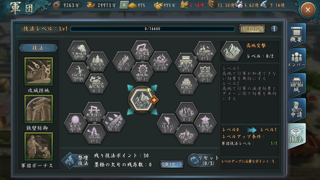 兵種強化系技法(盾兵強化、槍兵強化、騎兵強化、弓兵強化)が削除され、代わりに混合火油や夜叉檑などの城防強化技法が追加されます。