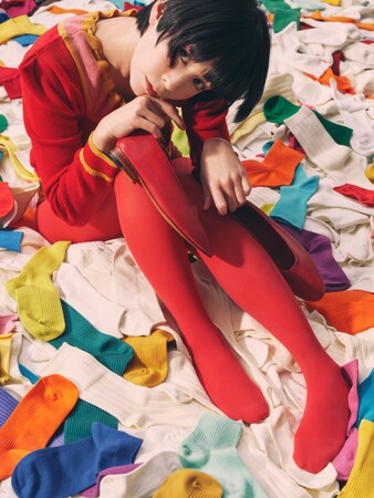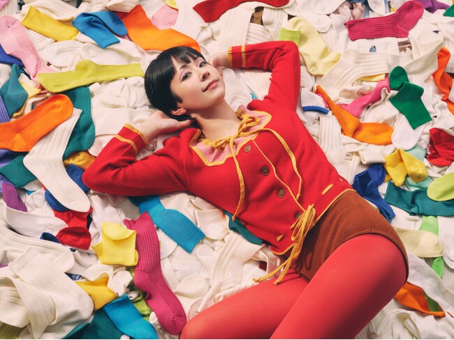 カエラさんの一番好きな色である “赤”のタイツを着用し、約2500足のカラフルなソックスに埋もれた圧巻のビジュアルにご注目ください。