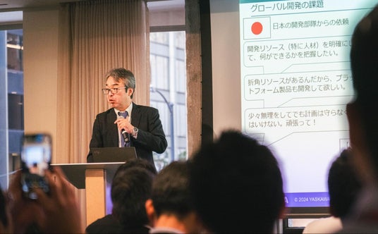 YASKAWA AMERICAは、直近10年で売上を1.5倍に伸ばしており、来年は$1billionの売上を目指す。開発拠点を含むグローバル約30ヵ国でネットワークを持つ同社の取組みとして、原氏自らの経験を元に、グローバル横断の開発リソースの可視化に関するエピソードなどを共有した。「具体的な効果を示しながら進めていくことが、海外との取り組みでは重要」と強調した。
