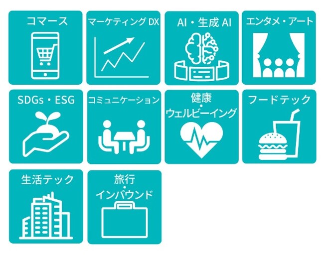 今回取り上げる100社は、「コマース(11社)」「マーケティングDX(10社)」「AI・生成AI、(7社)」「エンタメ・アート(14社)」「SDGs・ESG(9社)」「コミュニケーション(8社)」「健康・ウェルビーイング(7社)」「フードテック(10社)」「生活テック(18社)」「旅行・インバウンド(6社)」という10分野の有望企業です。