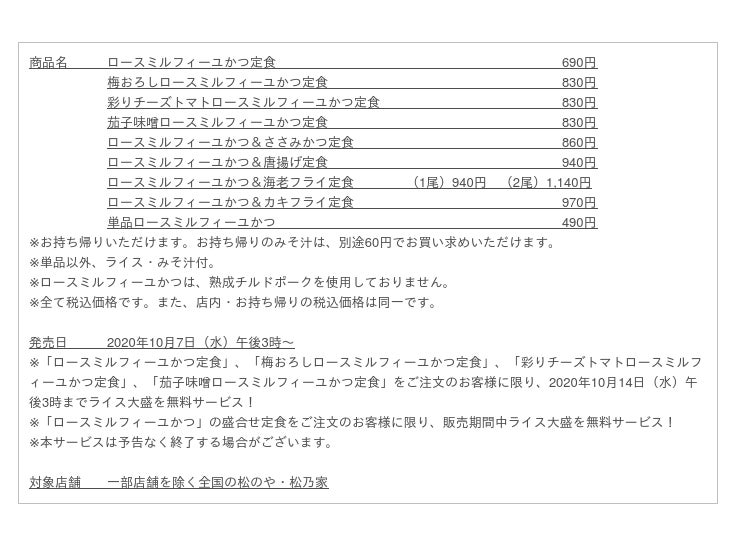 発売を記念して、「ロースミルフィーユかつ定食」、「梅おろしロースミルフィーユかつ定食」、「彩りチーズトマトロースミルフィーユかつ定食」、「茄子味噌ロースミルフィーユかつ定食」をご注文のお客様に限り、2020年10月14日(水)午後3時までライス大盛を無料サービス、「ロースミルフィーユかつ」の盛合せ定食をご注文のお客様に限り、販売期間中ライス大盛を無料サービスいたします!