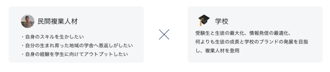 複業人材が学校教員とともに学校課題解決に取り組み、教育改革の実現を目指すプロジェクトです。社会に開かれた教育課程が求められている今、 様々な専門性や経験を持った複業人材と、生徒や教員の協働を創出します。