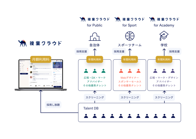 あわせて本日より、更なる事業拡大のため、スポーツチーム向けの「複業クラウド for Sport」、教育機関向けの「複業クラウド for Academy」を正式に提供開始しました。大企業の副業/複業解禁が広がりを見せる中、自治体向けの「複業クラウド for Public」を含め、ESGや地方創生の推進を実現するのが今回スタートしたサービスです。これまで「中間手数料が高い・成約手数料が発生する・いい人材と出会えない」と敬遠されてきた方々にも導入検討いただきやすいサービス設計で、複業の社会実装を推進します。