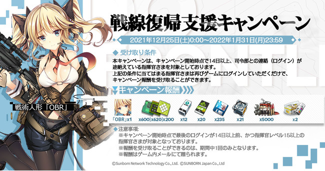 キャンペーン開始時点で14日以上ログインを行っていない方を対象とした、復帰支援のキャンペーンを「12月25日(土)0:00」より開始いたします。