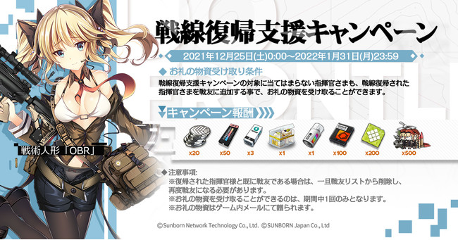 対象の方は☆3 ライフル「OBR」をはじめ、各種資源などのゲームには欠かせないアイテムがログインするだけで入手できます。