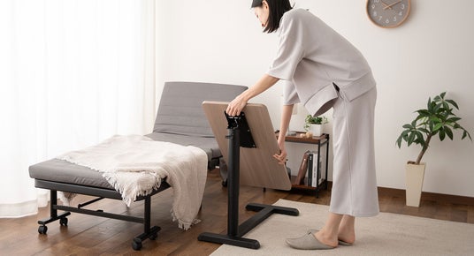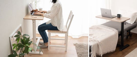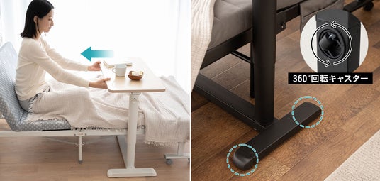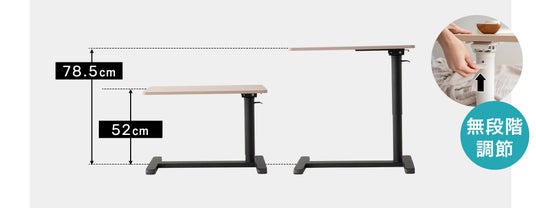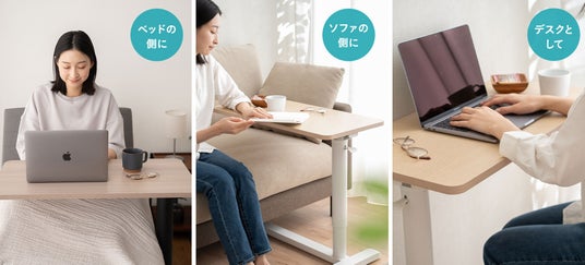 高さが調節でき、小回りの利く便利なサイズなので、デスクワークや読書、食事、介護のシーンなど、 あらゆる場面で活躍します。