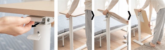天板を折りたたむことで、ソファやベッドの側にスッキリと収納できます。使用しない時でも生活空間を圧迫せず、部屋を広く使えるのが特徴です。