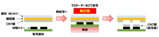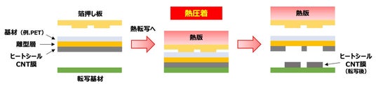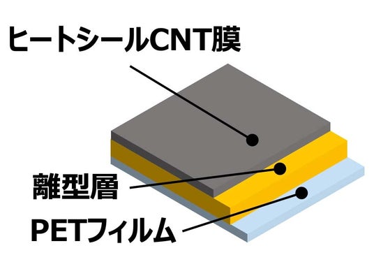 『熱転写CNT透明導電ナノシート』は、基材であるPETフィルムと、厚み1μm以下のCNT膜との間に離型層を設けた三層構造です。シートを加熱・加圧することで、基材からCNT膜のみが剥離し、対象物の表面に転写されることで導電性を付与することができます。