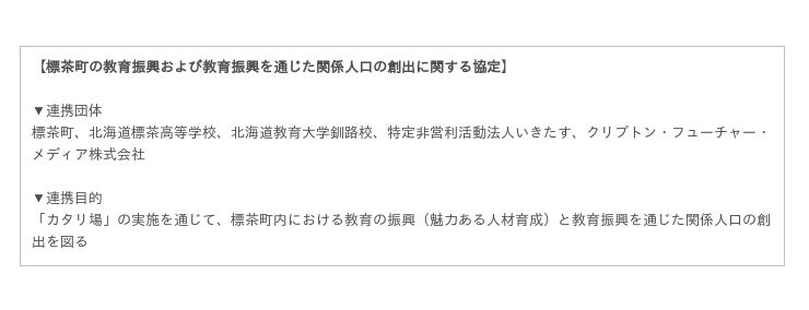 標茶町内にある唯一の高校・北海道標茶高等学校で平成30年度から取り入れている「カタリ場」は、クリプトンの支援のもと、特定非営利活動法人いきたすと北海道教育大学釧路校の共同で開催。この特別授業をこれからも継続するにあたり、標茶町内の教育振興と教育振興を通じた関係人口の創出につなげていく目的で、今回の協定締結に至りました。