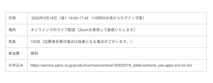 セミナー詳細ページ:https://service.aainc.co.jp/product/echoes/seminar/20220318_allide-betrend_use-apps-sns-for-biz