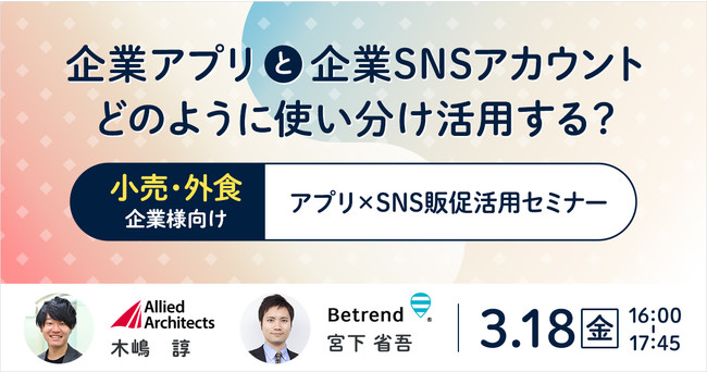 SaaSとデジタル人材で企業のマーケティングDXを支援するアライドアーキテクツ株式会社(東京都渋谷区、代表取締役社長 CEO:中村壮秀、プロダクトカンパニー プレジデント:村岡弥真人、証券コード:6081)は、「企業アプリと企業SNSアカウント、どのように使い分け活用する?」をテーマにしたオンラインセミナー「アプリ×SNS販促活用セミナー」を3月18日(金)に実施します。