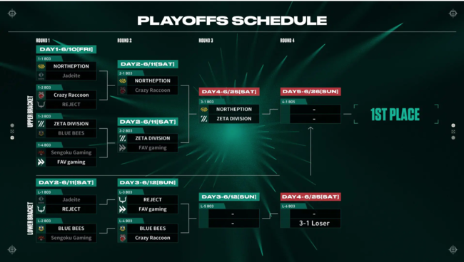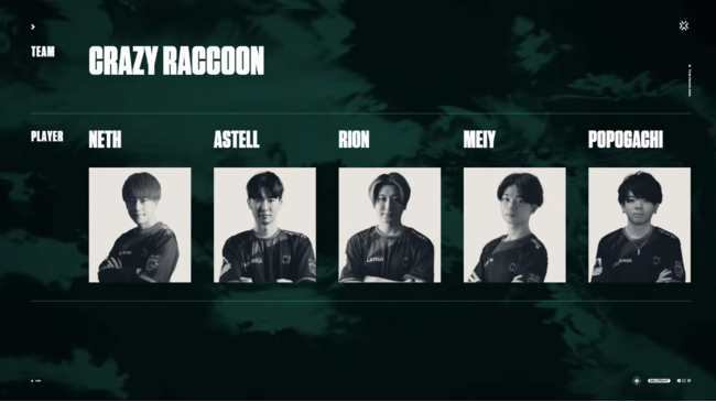 『2022 VALORANT Champions Tour Challengers Japan』を主催する合同会社ライアットゲームズと、大会を運営するRAGE(株式会社CyberZ、エイベックス・エンタテインメント株式会社、株式会社テレビ朝日)は、6月25日(土)、26日(日)に「さいたまスーパーアリーナ」にて開催するPlayoff FinalsにCrazy Raccoon、NORTHEPTION、ZETA DIVISIONの3チームが出場することに決定しました。※チームA-Z順