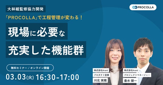 株式会社Arentは、2026年3月3日(火)に、「プロコラで工程管理が変わる~現場に必要な充実した機能群~」をテーマに、大林組と共同開発したAIクラウド工程管理システム「PROCOLLA(プロコラ)」の解説セミナーをオンラインにて開催します。