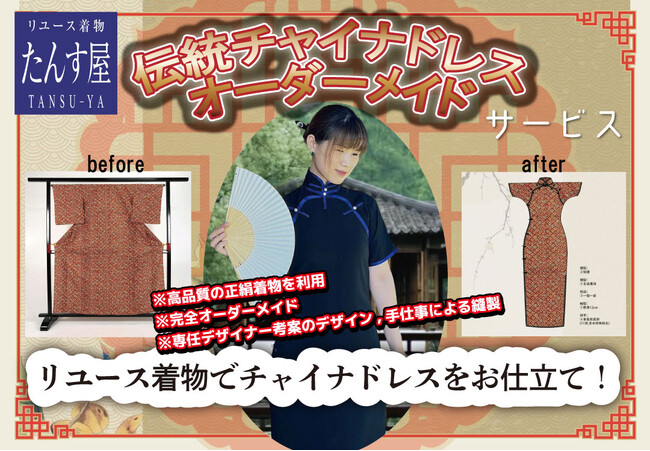 リユース着物の買取販売「たんす屋」が、再利用可能な着物をチャイナドレスに仕立て直す新サービスを2023年11月から開始いたします。
