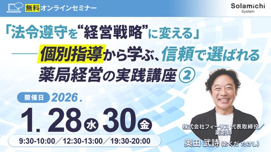 クラウド電子薬歴『CARADA 電子薬歴 Solamichi』の企画・開発・販売を行う株式会社ソラミチシステムは、無料オンラインセミナー「『法令遵守を“経営戦略”に変える』──個別指導から学ぶ、信頼で選ばれる薬局経営の実践講座2.」を1月28日(水)、30日(金)に開催します。