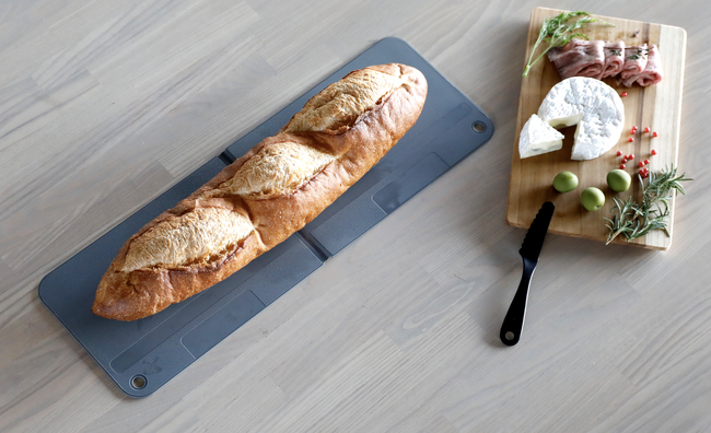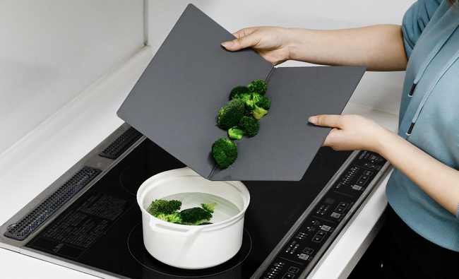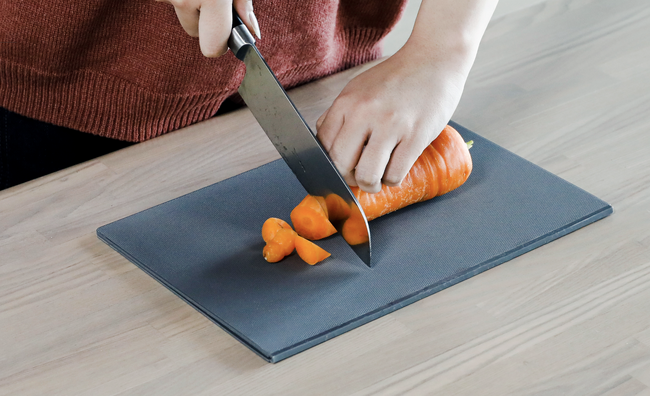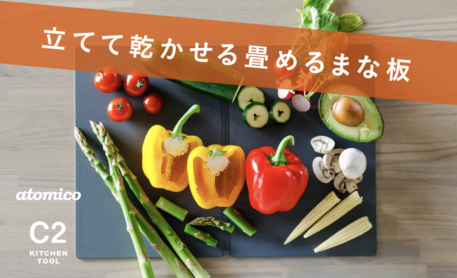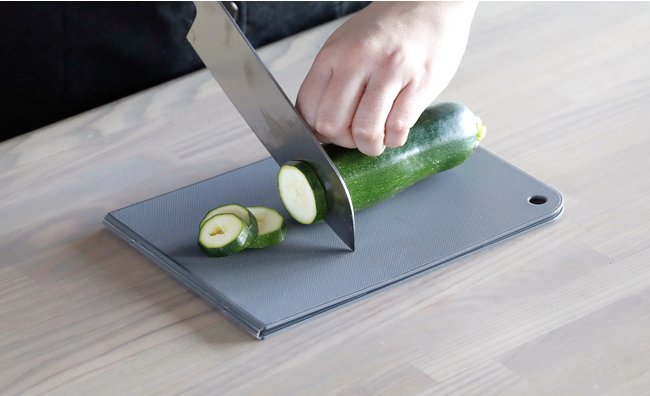 自立するので洗った後も場所を選ばず乾かせる、「立てて乾かせる畳めるまな板」。