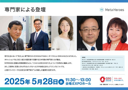 株式会社Meta Heroes(本社:大阪府大阪市、代表取締役:松石和俊、以下「当社」)は、2025年5月28日(水)、大阪・関西万博「EXPOホール」にて開催されるイベント「防災万博」において、防災・減災分野の第一線で活躍する専門家による特別登壇セッションを11:30~13:00に実施いたします。