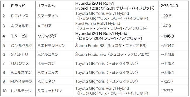 エストニア出身のオィット・タナックと Martin Jarveoja(マルティン・ジェルペオジャ)は金曜日のリタイアから回復し、新しいスコアシステムで4ポイントを獲得して日曜日を4位で終えました。土曜日、Hyundai i20 N Rally1 Hybrid 8号車は、不利な状況にも関わらず、トップを目指して走行し、オープニングテストでの勝利を含め、この日は3本のステージのタイムがトップ3に入りました。Hyundai Shell Mobis World Rally Team所属の2人は、パワーステージでさらに2ポイントを獲得して大会を終えました。