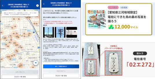 今回、本サービスが中部電力パワーグリッド株式会社に採用され、春先に発生する鳥の巣による停電を防ぐための調査キャンペーン(クエスト)を本日から愛知県三河地区で開始しました。ポイ活アプリを活用した鳥の巣の調査は国内初※の取組みです。
