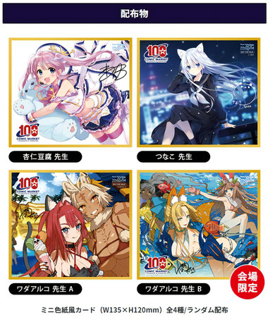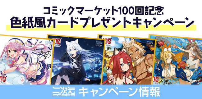 『コミックマーケット』100回目の開催を記念し<C100回記念 色紙風カード>プレゼントキャンペーンを実施。コミックマーケット100「二次元コスパブース(No.312)」、コスパWEB通販にて対象商品¥4,000(税込)以上ご購入ごとに、杏仁豆腐 先生、つなこ 先生、ワダアルコ 先生によるイラスト入りの<C100回記念 色紙風カード>を1枚プレゼントいたします。
