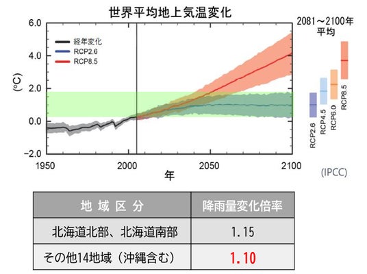 - パリ協定の、世界の平均気温上昇を2℃より十分低く保つ目標を達成した場合でも、2040年頃には横浜市で降雨量が1.1倍に増加する予測が示されている。
