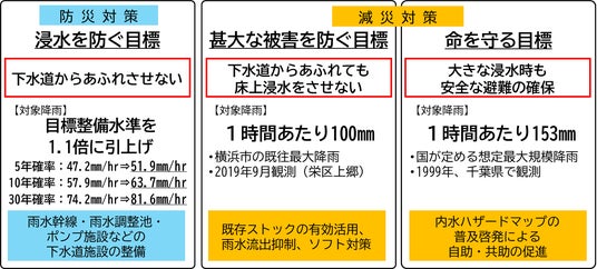 そこで、これまでの浸水対策の進捗状況や気候変動の影響を踏まえた雨に強い強靭なまちづくりを一層推進することを目的として、下水道による浸水対策の目標や対策の進め方など、これからの下水道による浸水対策をとりまとめた「横浜市下水道浸水対策プラン」を新たに策定しました。