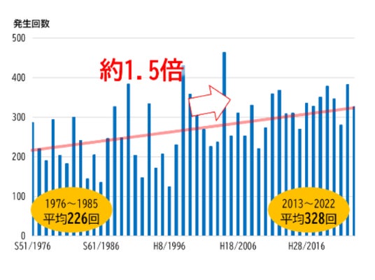 - 日本全国で1時間あたり50mm以上の強い雨の発生回数が約40年前に比べて1.5倍に増加