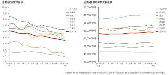 【2025年1月末時点の主要7区空室率・平均募集賃料の動向】
