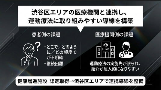 これに伴い、渋谷区・原宿/表参道エリアでクリニックを運営されており、来院患者様に対して運動療法の実施先・継続先を探している医師の方々に向けて、当社施設を運動療法を実施・提供可能な施設としてご案内し、連携体制の構築を進めます。医療機関側の治療方針や留意事項を踏まえ、患者様が安全に運動へ取り組めるよう、実施環境と運用導線の整備を重視します。