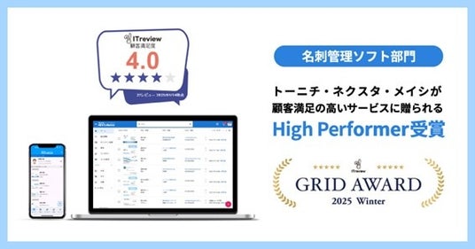 東日印刷株式会社(本社:東京都江東区、社長:西川光昭、以下 TONICHI〈https://tonichi-printing.co.jp〉)のIT事業部門・T-NEXT本部が開発・販売する法人向け名刺管理アプリ「ネクスタ・メイシ」(https://tnexta.com/) が、アイティクラウド株式会社が運営する国内最大級のIT製品/SaaSのレビューサイト「ITreview」の「ITreview Grid Award 2025 Winter」の名刺管理ソフト部門において、顧客満足度の高いサービスに贈られる「High Performer」を受賞しました。