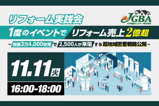 一般社団法人日本優良ビルダー普及協会(事務局:東京都港区、代表理事:田島亮、以下「JGBA」)は去る11月11日(火)リフォーム実践会「1度のイベントでリフォーム売上2億超」~商圏2万4,000世帯で2,500人が来場する超地域密着戦略公開~ セミナーをリアルとオンラインで開催し、当日は34名の方に参加いただきました。