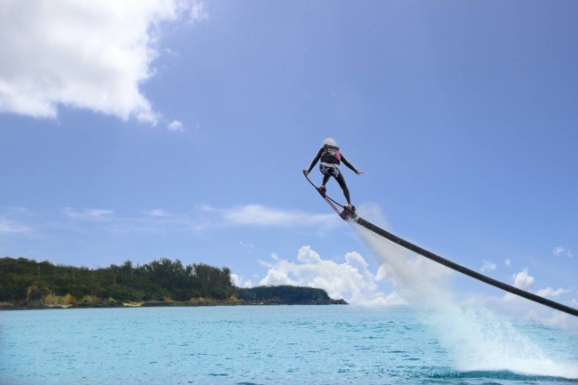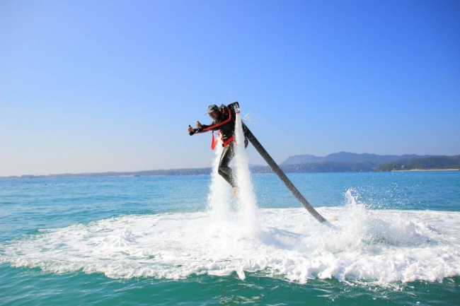 スケートボードやスノーボードのように横位置で乗り、水上バイクの噴射の力で空中を自由に飛び回ります。