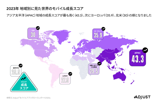 モバイルアプリの計測・分析ツールを提供するAdjust(https://www.adjust.com/ja/)(本社:独・ベルリン、CEO:サイモン・デュサール、日本ゼネラルマネージャー:佐々直紀)は、2023年度版の「モバイルアプリグロースレポート 2023」(https://www.adjust.com/ja/resources/ebooks/mobile-app-growth-report-2023/)を発表しました。本レポートでは、新しい成長スコア指標を発表し、世界的なアプリパフォーマンスに関する詳細な分析を提供するとともに、最も成熟した市場と未開拓のユーザー獲得の成長が期待できる新興市場についてのインサイトを明らかにしています。