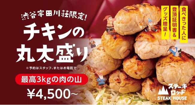 株式会社ファイブグループ(東京都武蔵野市:代表取締役社長 坂本憲史)の関連会社である「スパゲッティーのパンチョ」などを手掛ける株式会社B級グルメ研究所(本社:東京都武蔵野市、代表取締役社長:坂本 憲史)は、運営するステーキハウス『ステーキロッヂ』の4店舗目、渋谷では2店舗目となる『ステーキロッヂ 渋谷宇田川店』オープンを記念して、渋谷宇田川店限定メガ盛りメニュー「チキンの丸太盛り」を“肉の日”2月9日(水)から発売いたします。