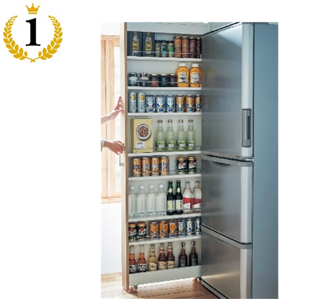 デッドスペースになりがちな、冷蔵庫横のわずか10cmの隙間で大容量の収納ができるところがポイント。コロナ禍を経て家の中の整理への関心が高まったこともあり、夏の収納問題を解決できる点が人気でした。