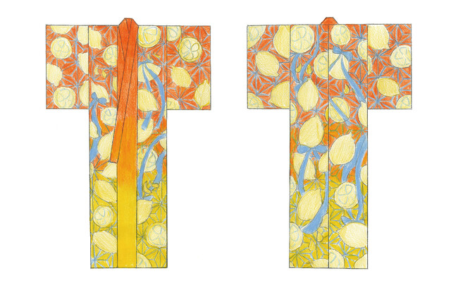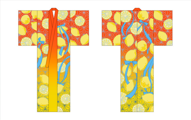 特に頑張ったグラデーションは向日葵色から橙色へと成長して行く様をイメージしました。麻の葉もそうですが、この着物はこれを着る人の体、または心が健やかに成長するようにという思いを込めています。そこに、花言葉が愛情であるレモンや、魔除けの意味を持つリボンをたくさん描くことでできるだけ苦が少なく、愛情にあふれて育つことをコンセプトとしました。
