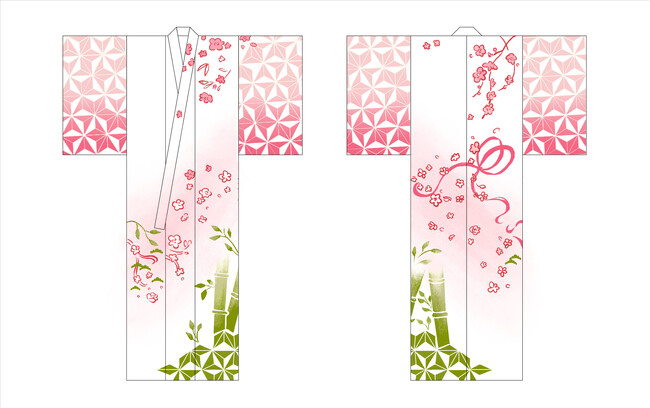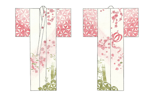 この着物は、柄に松竹梅を取り入れ、白地に茜色の梅を配置することで茜色がよく映えるようにしました。また、上から下にかけて早春の梅から夏の竹に移り変わる様子も表現し、季節の移り変わりを感じられるようにしました。麻の葉は袖とすそで色を変え、グラデーションにして季節とともに変わる色にもこだわっています。着るだけで自然の美しさを感じられるようにデザインしました。