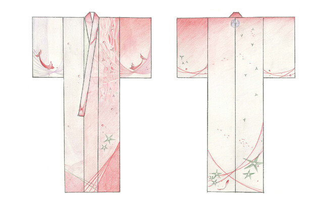 この着物は、夕焼けの景色を表した着物です。右の衣の柄は波の様子を表していて。右と左で重ねた時に華やかになるようにしました。同じ色の線を統一して使い、ポイントにしました。赤系の色だけでなく、緑青を使い、星を魚を使って描いたことで、全体を落ち着いた着物にしました。