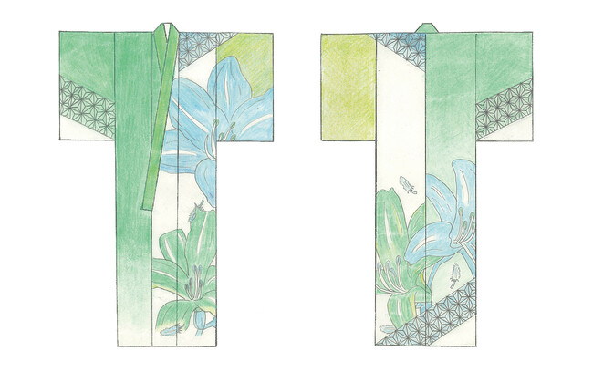 かたの部分と、そでの部分にある、麻の葉模様のグラデーションに気をつけました。また裏の面を半分にわけている線を越えている花びらと、越えていない花びらがあって目の錯覚を利用しました。それに加えて裏の面に2つの花の前を防ぐように麻の葉を描いて奥行きがあるようにしました。