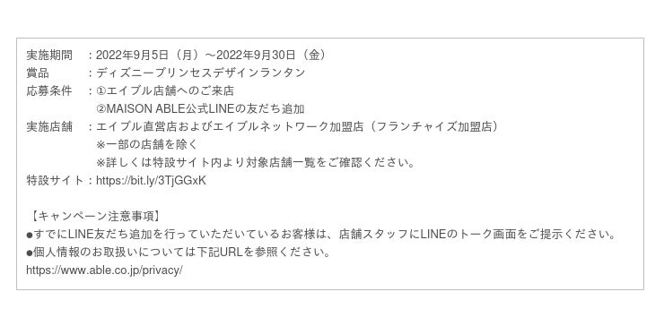 キャンペーン期間中、エイブルの店舗(一部の店舗を除く)へご来店の上、MAISON ABLE公式LINEの友だち追加をいただいた方の中から抽選で500名様に、『ディズニープリンセスデザインランタンをプレゼント』いたします。