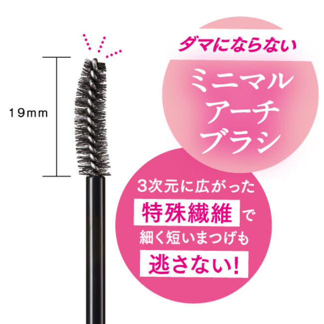 三次元に広がる特殊繊維を採用した小回りのきく19mmのミニマルアーチブラシで細く短いまつげも逃さずキャッチ。塗り重ねてもダマになりません。