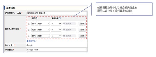 日程調整フォームに複数名の担当者を設定し、誰か1名でも参加可能なら空き日程として表示することができます。