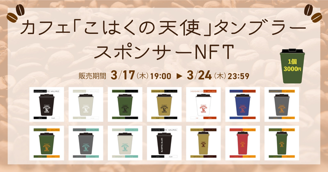 今回のプロジェクトは飲食店業界初の取り組みで、「こはくの天使」が販売しているタンブラーをスポンサーNFTとして発行し、3月17日(木)より14個限定で販売いたします。また、タンブラーに記載されたQRコードからも、スポンサーNFTをご購入いただけます。