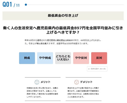 今回は鹿児島県政に関する11問の質問をご用意しました。選挙ドットコムと南日本新聞が共同で設問の設計、候補者へのアンケートを行い、その回答を基に制作しています。最低賃金の引上げや少子化対策と高齢者福祉、川内原発、体育館建設など幅広い分野の設問になりますが、全ての質問に概要を説明する「解説文」と「メリット」「デメリット」を記載することで、利用者の判断材料をご提供します。
