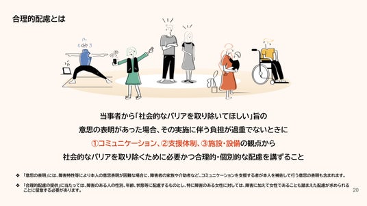 合理的配慮のある対応を行うには、サービスを提供する人と受ける人の間での対話を通じ、社会に存在する障壁を理解した上で、適切な配慮をともに考えることが重要です。