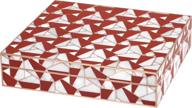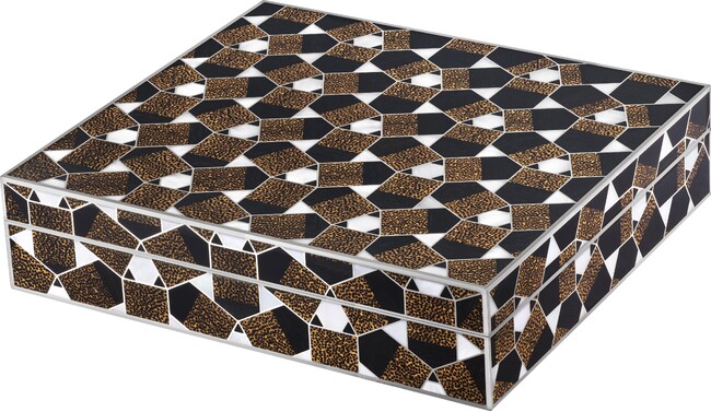 森口氏には、何かまったく新しいものを作りたい、美しいものを作りたい、という強い思いがありました。その思いを羅針盤に、長い間思考を巡らせ続けたある日、時が満たずに保管されていた草案を検証するうちに「箱」のイメージが立ち現れました。軽やかなリズムで秩序をもって展開してゆく黒と白、赤と白の幾何学的な図形を衣のように纏った箱です。大切なものを包み込み、日常に寄り添いながらも凛とした存在感を放つ、美しい佇まいの箱の姿が示されました。
