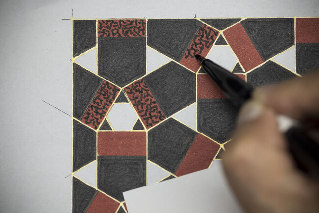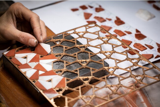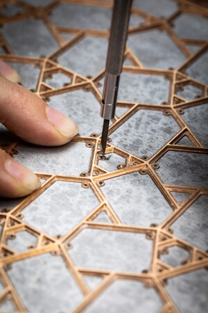 この美を具現化するためにヴァン クリーフ&アーペルは様々な専門的技術を持つ職人たちと協力しました。箱の立体構造を構築する技、幾何学的デザインをモザイクで仕上げる技、モザイクをはめ込むための緻密な枠組みを造形する技、有機的な素材を吟味し、その重さや質感までも見極める技、作品を隅々まで美しく磨き上げる技など、まぎれもなく本物の伝統的なジュエリー制作の様々な技巧を持つ職人たちが互いに、それぞれの専門分野の仕事を尊重しながら自身の技を存分にふるいました。この作品では特に、幾何学的な形のモザイクに使用する素材の選択に特別な注意が払われました。森口氏により示された作品デザインに存在する友禅の色彩や蒔糊の技法を表現するするために様々な素材がひとつひとつ吟味されました。選び抜かれた、レッドジャスパーやマザーオブパール、ブラックエボニーや棕櫚の木などの自然の素材が組み合わされ、森口氏のデザインイメージと一体化した作品は、友禅の精神は共有しながらも、それとは異なる世界を創造しています。