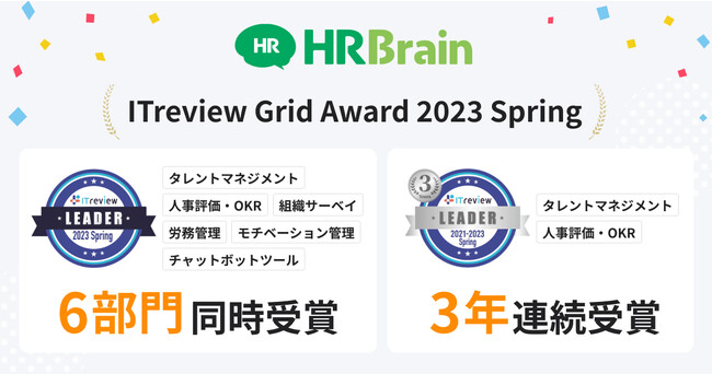 株式会社HRBrain(東京都品川区、代表取締役CEO:堀 浩輝、以下「当社」)が提供する、タレントマネジメントシステム「HRBrain」は、「ITreview Grid Award 2023 Spring」の6部門(「タレントマネジメント」「人事評価・OKR」「組織サーベイ」「労務管理」「モチベーション管理」「チャットボットツール」)にてユーザー満足度と認知度の高い製品に贈られる称号「Leader」を受賞しました。